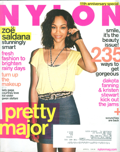 The cover of Nylon Magazine's 11th Anniversary Special Edition is delightfully brightened up by Zoe Saldana, star of James Cameron's latest movie, Avatar. The issue includes a full length interview with Zoe, fun summer styles and pumped up beauty tips guaranteed to get you gorgeous!