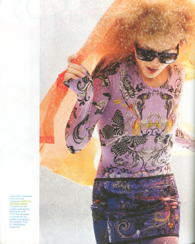 In the story titled We Can Stand The Rain, you get an array of vinyl, plastic and patent-leather clothes that will help you stay dry through the crazy April showers while still looking great! On the fifth page of the spread you can see We Love ColorsOrchid Pink Microfiber Tights paired with a Versace bodysuit and plastic skirt for a chic, rainy day look.