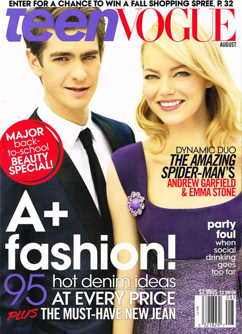 On the cover of Teen Vogue is the dynamic duo, Andrew Garfield and Emma Stone from this years mega hit The Amazing Spiderman.