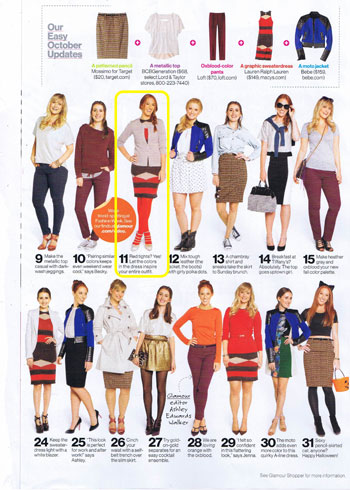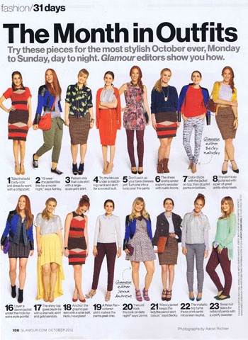 Grown up Emma Watson looks stunning on the cover of Glamour. In the fashion section they make sure that you have enough clothes for the whole month! The section titled The Month in Outfits has a new outfit for you to try everyday. Outfit #11 is paired with our super bright scarlet red tights. Pair them with anything you want. Just remember... they are not called scarlet red for nothing!