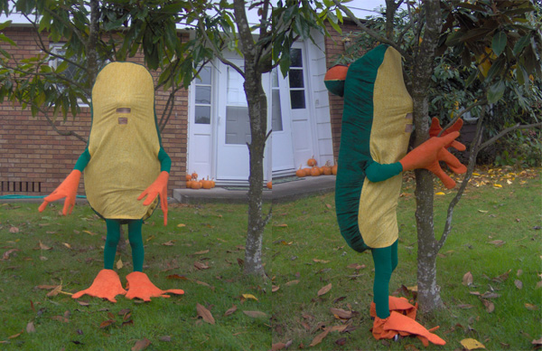 Here are photos of my son, Atticus, age 4, in his poison dart frog costume. The costume was made complete by the emerald colored leotard and tights - and he was thrilled to have two costumes in one ("look mom, I am Peter Pan when I take my frog body off!"). Thanks so much for your extra dedication in anticipation of Hurricane Wilma. We were one of the customers whose order was made over the weekend and shipped out Sunday evening. We were absolutely thrilled to receive it Saturday afternoon, two days before Halloween. Thanks, Jane