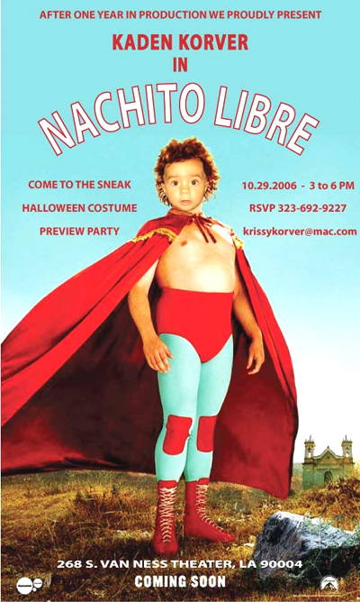 Okay, here is what your pastel mint and scarlet tights turned into – our very own Nachito Libre. The invitation shows what we were shooting for as far as authenticity goes – true Nacho Libre.