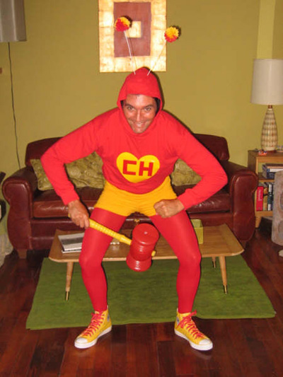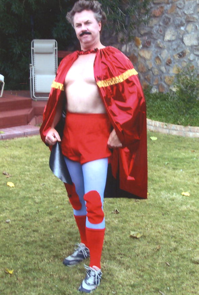 Hello there, You all asked us to send you pictures of how we used your tights, so that's what we did. After seeing the movie "Nacho Libre", my wife insisted that I be Nacho for Halloween. There was no Nacho costume to be found, so we had to put it together piece by piece. No light blue tights to be found in El Paso, at least not for older guys! So, we are happy as ever that we found your web site! While on the site, my wife and daughter saw some stuff they liked and also ordered tights for themselves! All I had to do was sew on a couple of red patches and the outfit was complete. Thanks for being there when I needed you. Tim W El Paso, TX