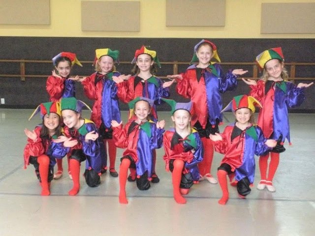 "The attached pictures is a group of my 7-8 year old dancers preparing to be Jesters in the ballet, Cinderella. Here they were trying on their tights (Scarlet Red Kids Microfiber Tights)...from your company...with their jester costumes made by our costume mistress!!! The tights look GREAT! Thanks so much!"