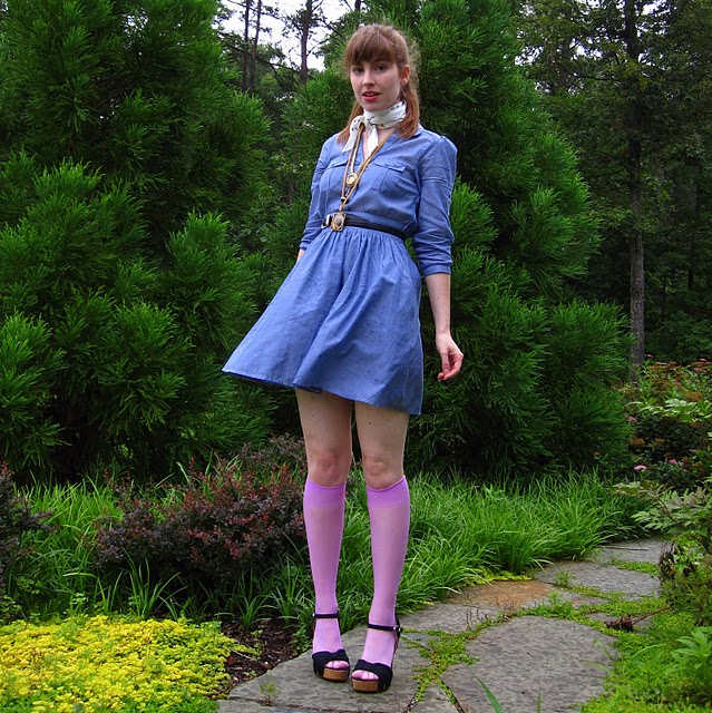 I did have to do some improvising, considering I don't own any turquoise thigh-highs, but I tried to keep the spirit of Laura's styling idea as present as I could with bright pink knee-highs, a skinny black belt, and a bunch of gold pendant necklaces.