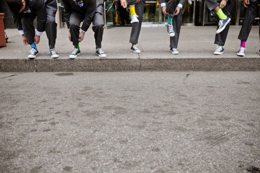 Stumped on how to incorporate bright, fun colors in your groomsmen's attire? Well Courtney's knew just where to hide the surprise! They all wore white and navy blue ties with varying designs along with a white dress shirt, but coming between their feet and their blue Chuck Taylors were We Love Colorsnylon socks in colors like Yellow, Scout Green, and Fuchsia! Check out the great wedding picture below of the guys showing off their stylish ankles.