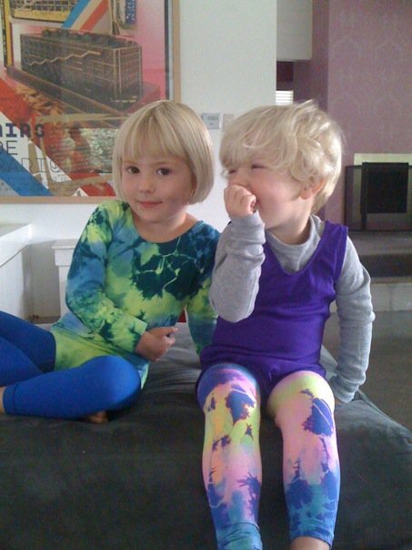 Rebecca W., who sent us the video of her daughter Betty Jean doing gymnastics in our tights and leotard, has now sent us an adorable picture of her two children wearing our (left-to-right) #7214 Splash Color Long Sleeve Scoop Neck Leotard, Royal Blue Kids Microfiber Footless Tights, Violet Kids Tank Leotard, and #7411 Splash Color Microfiber Footless Tights.