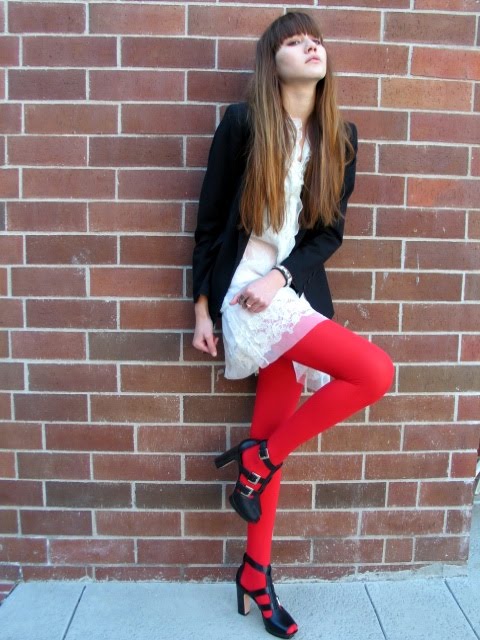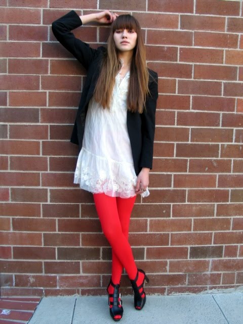 Natalie S. from the wonderful blog Natalie Off Duty was more than enthusiastic to try out our Scarlet Red MicroFiber Tights and give all of you an elegant, yet stylish outfit idea to pair them with. The end result was beautiful! In the photos below, you'll see that a pop of color can really bring a black and white outfit to life.