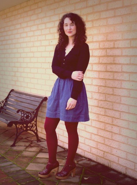 Megan Nielsen had a dress that she loved, just wasn’t too fond of the buttons. Being the button-saver that she is, she removed the buttons on the dress, saved them, and replaced them with others that she had in her “stash”. When she found this shirt, she knew that the buttons would fit. Lo and behold, she made it work. She paired this fabulous look with a pair of Maroon We Love Colors tights, and had a look where she was ready to hit the streets.