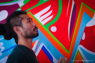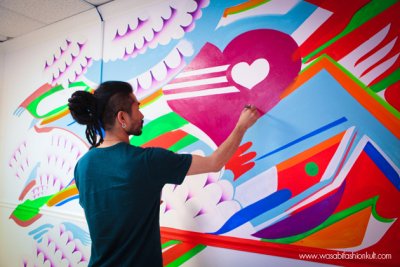 A Japanese artist, who goes by the name of Mon was recently in the We Love Colors offices in sunny Miami, FL painting a rather elaborate and colorful mural. Mon’s art tends to be very abstract including images of dragons and rainbows. Take a look at some of the work he did in our office!
