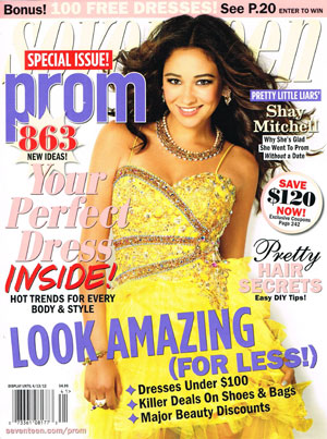 Pretty Little Liars star, Shay Mitchell, is looking quite gorgeous on the cover of this spring's SeventeenProm issue. With prom around the corner there are so many choices for you to choose from that will surely make your night magical. The real party starts after the prom. In the Time to Party! section the looks go from glam to a comfortable chic. The dresses are worn with sneakers, We Love Colorssocks and comfy jackets with pushed up sleeves. Prom is a time to have fun and the best way to express that is with hints of bright color.
