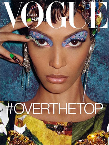 Vogue Italia is truly making a fashion statement this month. At the botttom of the cover in large letters is #overthetop. This is very appropriate for the look they gave model Joan Smalls.