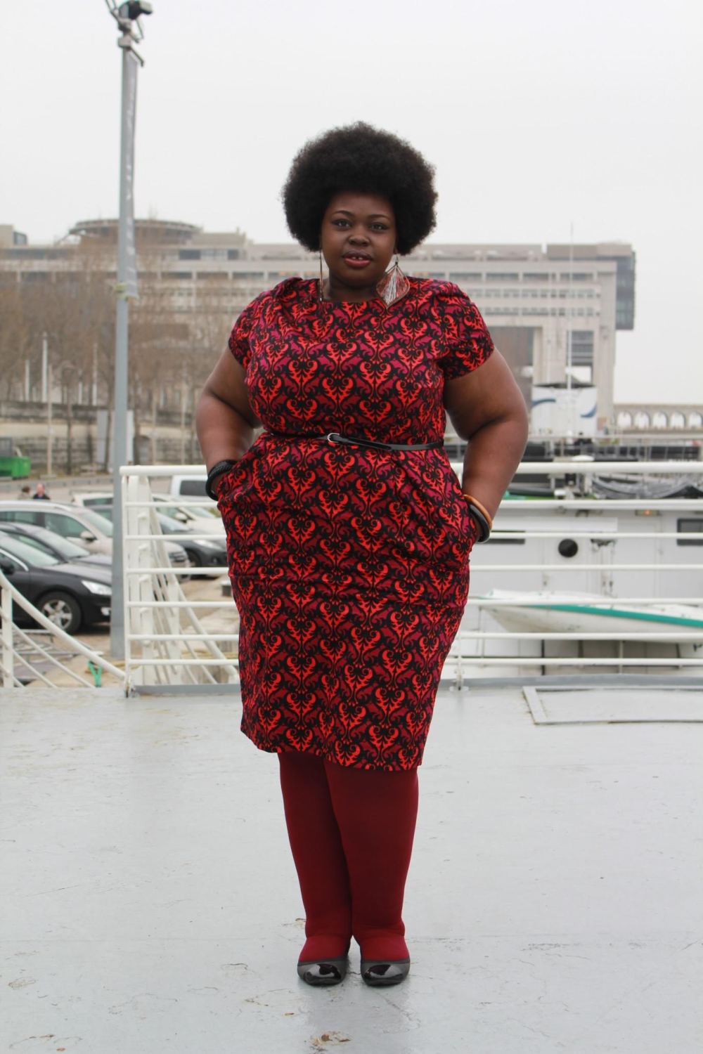 Her take on a red print dress matching with We Love Colors plus size tights in maroon. Talk about rocking those curves!