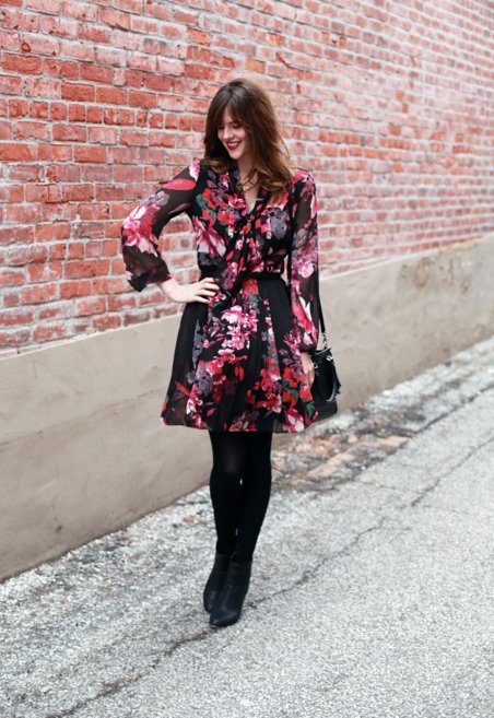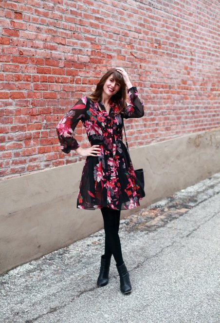 Blogger Jessica from What I Wore was kind enough to share these photos of her floral chiffon dress paired with black We Love Colors tights.