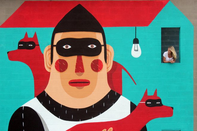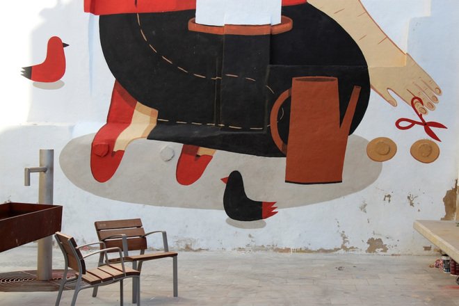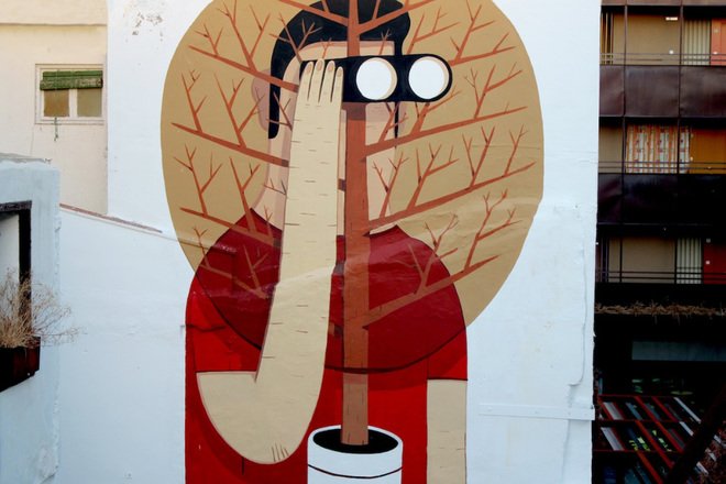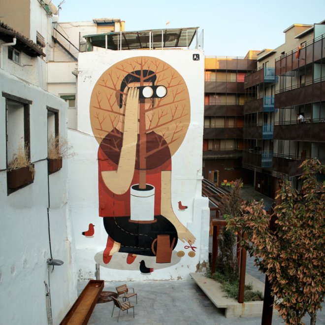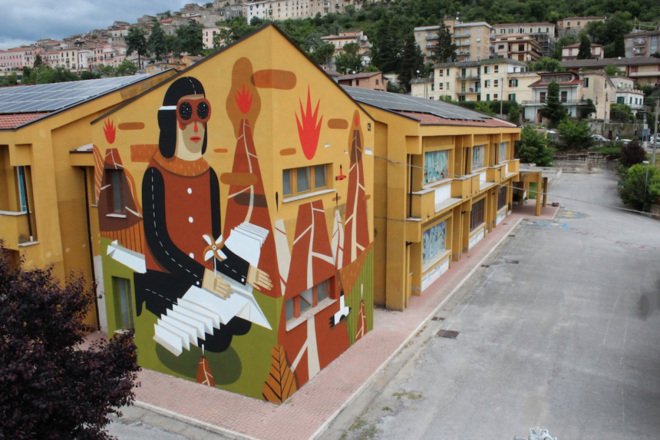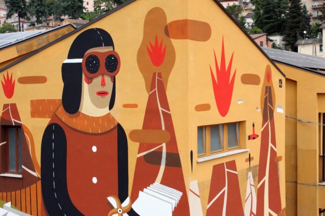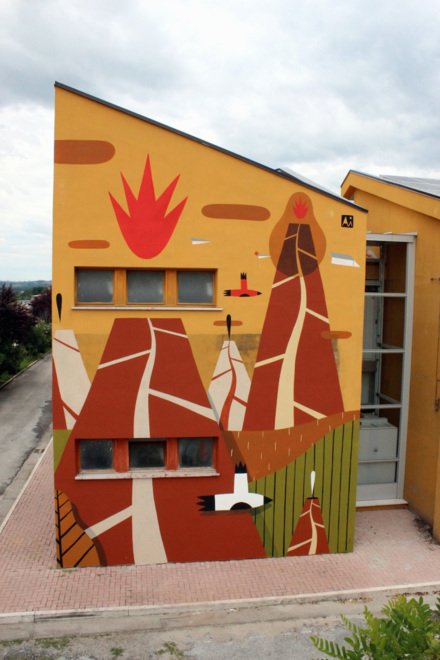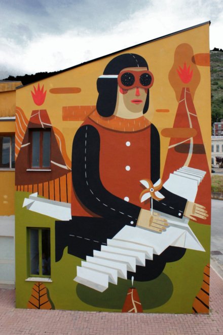 Born in Foggia in 1986, he lives and works between Rome and Nuremberg. He creates bright multi-layered images, used either for drawings and etchings or for big murals, taking inspiration from every day life and playing with synthetic shapes, bright colors and open titles. Since 2008 he have made several huge murals in public spaces, working among the others, for Roma 3 University and Fubon Art Foundation in Taipei. In 2012 he has been invited by the Fine Art Academy of Rome to paint a huge mural for the launch of the new headquarter. In the same year he took part at Bien Urbain Festival to paint a three buildings big mural for the University Campus of Besançon (France). He created a mural of over 300 meters for Saba School in Algeria and, together with the inmates, two huge murals in the yard of the “maximum security” zone of Rebibbia prison. His work has been presented at several exhibitions and festivals in Europe, Japan, Korea, Taiwan, Russia and the United States. Agostino Iacurci's website here.