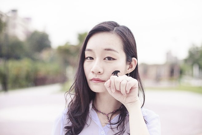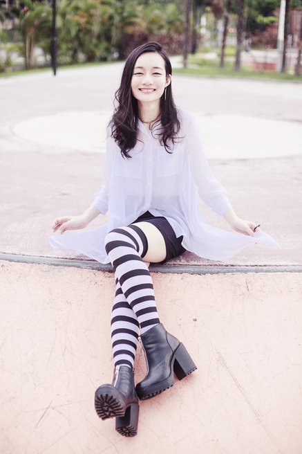 Pupuren knows that and she wears our black and white Thigh Highs with a whimsical sheer top/dress and black shorts. She is keeping it simple with small and cute accessories and a statement ring.