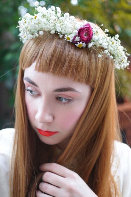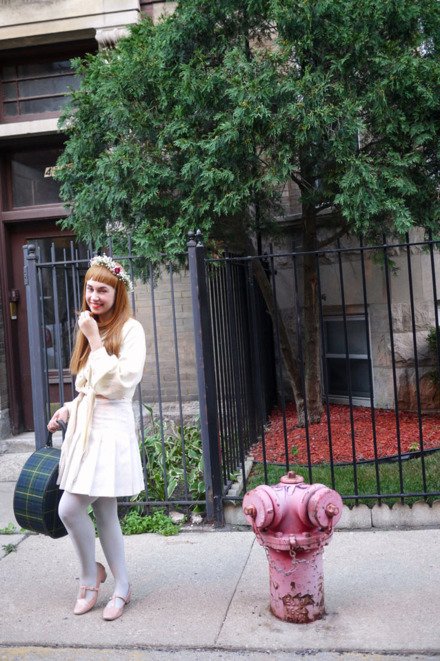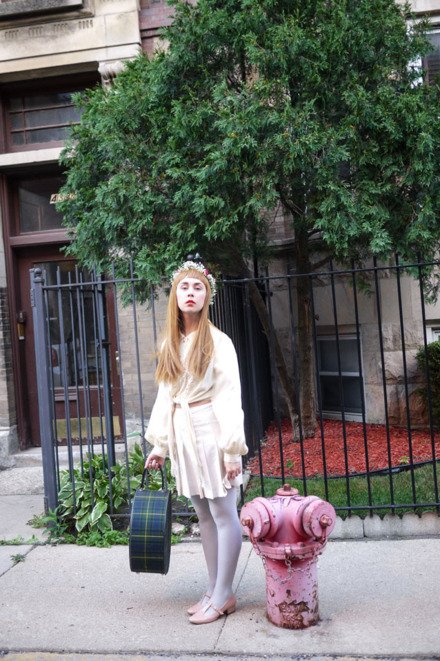 Can you feel the smell of flowers on Polly’s head? She just made for fist time a fresh flower crown and it came out really good. Make her outfit even cuter, if that’s possible. Her signature style is vintage inspired, sweet and very girly. On this outfit she mainly wore light tones, an ivory top and skirt, pastel pink socks and light grey We Love Colors tights. To break with the pale color palette Polly added a bright orange on her lips and a vintage plaid suitcase. She feels like if she popped out from a modern version of the movie Brigadoon, she said in her blog.