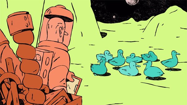 A really good fun little animation, directed by Titouan Bordeau, about a man and some ducks somewhere out in space. The artist made the film in his second year at l’école de la Poudrière. Watch this awesome video! artist's tumblr here.