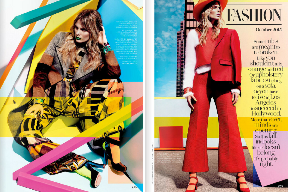 Canada’s number one fashion and beauty publication, Fashion Magazine, featured We Love Colors in their October 2015 issue. They used our Style# 1551: Nylon Socks in Orange to add a pop of color to an all-red ensemble in the FASHION spread. Photographed by Chris Nicholls, stylist Zeina Esmail complimented a neutral outfit by adding bright hues to the look with We Love Colors socks in Neon Green and a green lip color. Our wide range of colors and patterns make us a go-to for unusual pairings and pops of color!