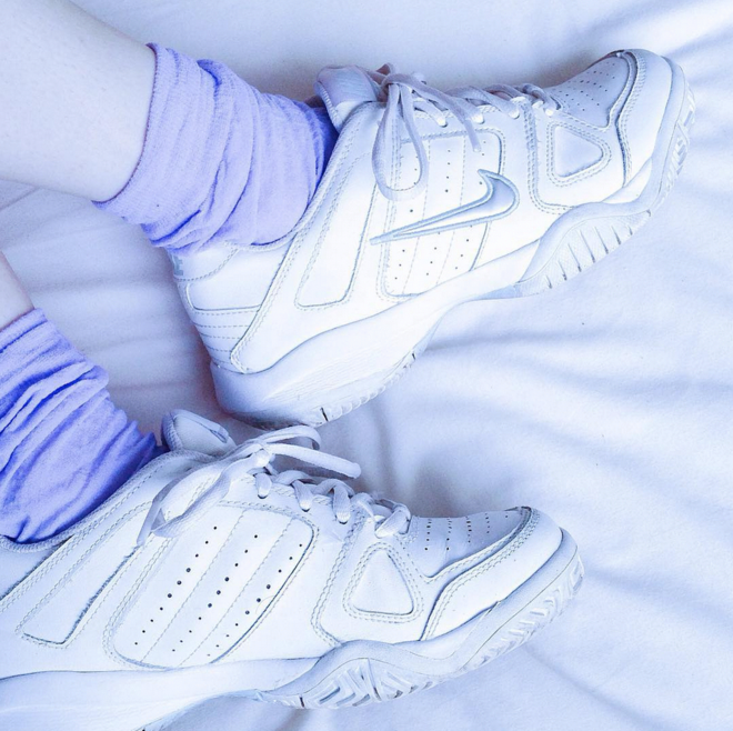 She is wearing We Love Colors fishnet shirt and a skater skirt. On the bottom picture lilac sheer knee highs rolled down with vintage nike sneakers.
