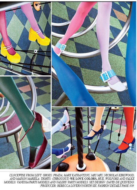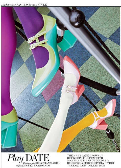 In fashion’s biggest issue of the year, Interview featured We Love Colors in the September issue. This leggy fashion spread Play Date, styled by Miguel Enamorado and photographed by Sebastian Mader, We Love Colors colorful hues are included throughout for a subversively sweet take on baby-doll kitsch. Complimented with stylish mary jane shoes, these candy colored tights really pop!