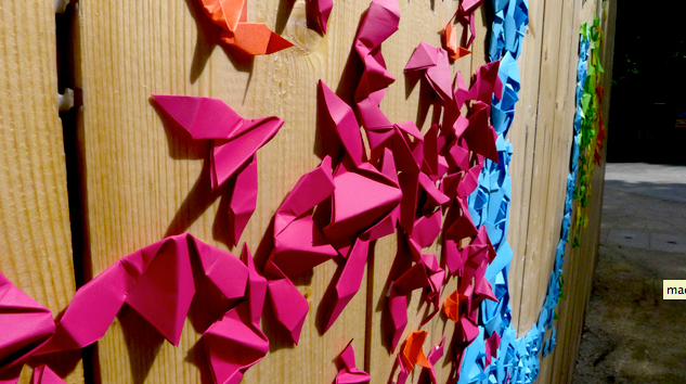 Mademoiselle Maurice is a French artist, following study Architecture in Lyon, worked in Geneva and Marseille she has settled before going live a year in Japan.Following this year in the country of the rising sun, and the tragic events of 11 March 2011 while living in Tokyo, she decided to start composing its artistic and urban works in connection with these facts. It is based on the legend of 1000 cranes and Sadako’s story, a little girl who lived the tragedy of Hiroshima. Now based in Paris, Mademoiselle Maurice develops and creates in her mini play countless colorful works  with the fruits of a rich influences and career lessons. Via origami, or lace or embroidery, or other mixed media, she gave birth to works in tune with their daily lives.These fetishes medium are paper and thread, she loves to shape these natural materials in a complex manner.Rising from the Paris grey, so was born a nebulous breaking works with urban monotony. Real punctuation of the city as his life’s work of this young artist imaginative displays radically outside the walls of his workspace.These openly positive creations, ultra colorful and immediate demands, emanates a carousel of emotion or everyone is echoed his own sensibility.Light in appearance, the work of Mademoiselle Maurice propose and raises many questions about human nature and the interactions that sustain people and the environment.Breath of fresh air but true evolutionary thinking, artistic approach Mademoiselle Maurice opens, paving colors duality as attractive as a repulsive reality, wide spaces of abstractions in the city. Be sure to check out the beautiful video below.Captura de pantalla 2015-03-02 a la(s) 10.45.21Captura de pantalla 2015-03-02 a la(s) 10.45.49Captura de pantalla 2015-03-02 a la(s) 10.45.56Captura de pantalla 2015-03-02 a la(s) 10.46.02Captura de pantalla 2015-03-02 a la(s) 10.46.09   , Visit artist website here.