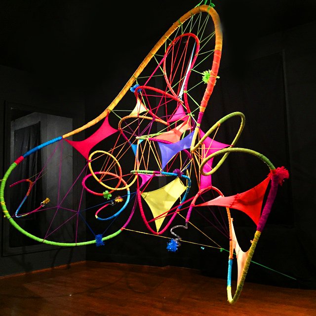 In Matrix: Renewal Installation Judy used our neon colors nylon/Lycra tights to make the sculpture pop up against the black gallery background. Adults and Kids attended to the venue to wrap up their "life troubles" in recycled shopping plastic bags and tape, and throwing them through the colorful spider like rainbow installation. Symbolically the problems stay there and people left the space refreshed, renewed after a joyful moment.