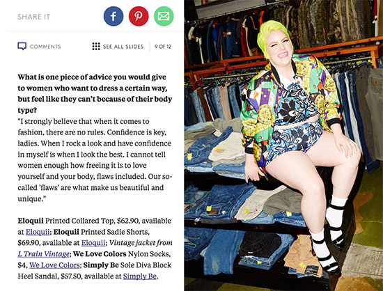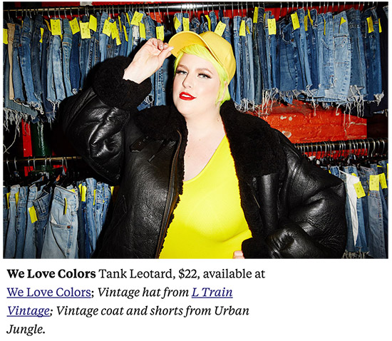 Fashion is all about taking risks! Margie Plus mixes pattern and color in this Refinery 29 style feature photographed by Lauren Perlstein. A We Love Colors tank leotard and socks were styled in this article proving that curvy women can and should wear whatever they want. No matter what size you are, confidence in any outfit is key.