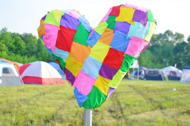 Mary England had a box of imperfect tights she wanted to turn into something fun for all the people at the Playa Del Fuego burner event in Delaware to enjoy. She set up a Merriment Materials table complete with bubbles, velvet posters, vintage slides, toys, accessories, temporary tattoos, and more for people to have fun with. The heart sculpture was installed right next to the table to draw people over to it. The sculpture was made out of chicken wire to create the heart shape, then covered with old wrapping paper to cover the sharp edges as to not rip the tights. Then, Mary cut out dozens of rectangles from imperfect pairs of We Love Colors tights and hot glued them in a patchwork/mosaic pattern all around the sculpture. She cut a hole in the bottom of the heart and inserted a metal pole inside to support it outside the tents and shade structure of her camp. It drew in a bunch of strangers to have fun at the Merriment Materials table. Mary had a great time at Playa Del Fuego, and was happy to bring some extra color to the event. If you're interested in learning more about burner events, you can check out her post about What To Expect At Your First Burn. Have you ever been to a burn? They're full of fabulous art projects, and we're so glad We Love Colors could be a part of this event. You can follow more colorful adventures on Mary's Instagram.