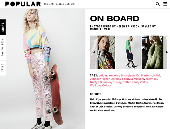 2016 is the year that skater-girl fashion comes back better than ever and for good. Popular Magazine features We Love Colors solid black nylon socks in a edgy yet chic fashion story, On Board. Styled by Michelle Veal and photographed by Helen Eriksson, this spread captures an innovative yet effortless aesthetic. We Love Colors socks serves as the perfect complement with black socks to offer a basic element to a colorful outfit. Whatever the vibe is for the day, We Love Colors serves as the perfect accessory for any look.