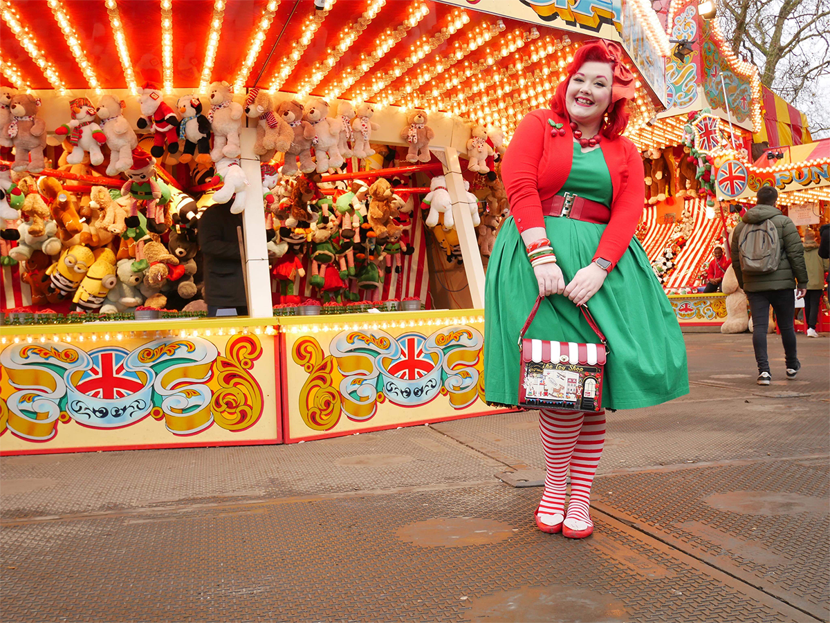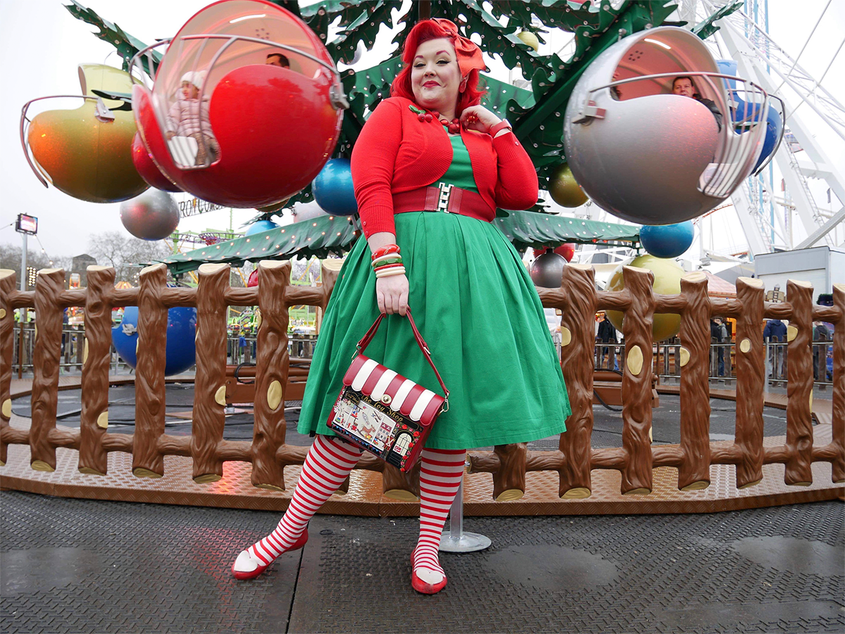 She used our White Striped Tights in Scarlet Red to create a holiday-inspired look. She paired the tights with a Christmas tree green dress and a cropped cardigan in red. Her red belt and matching candy striped handbag give this outfit that extra touch of fun and cheer! We also love her red and white heart -accented flats.