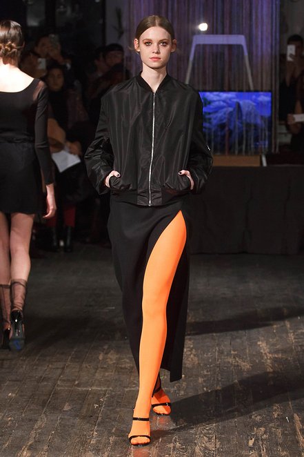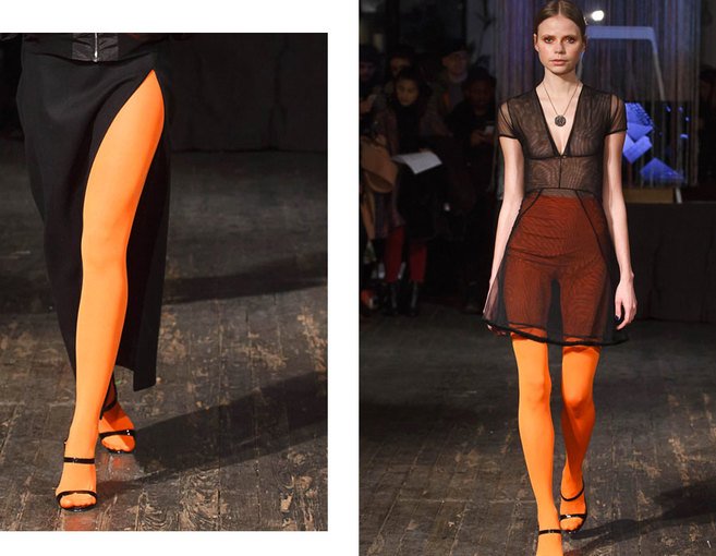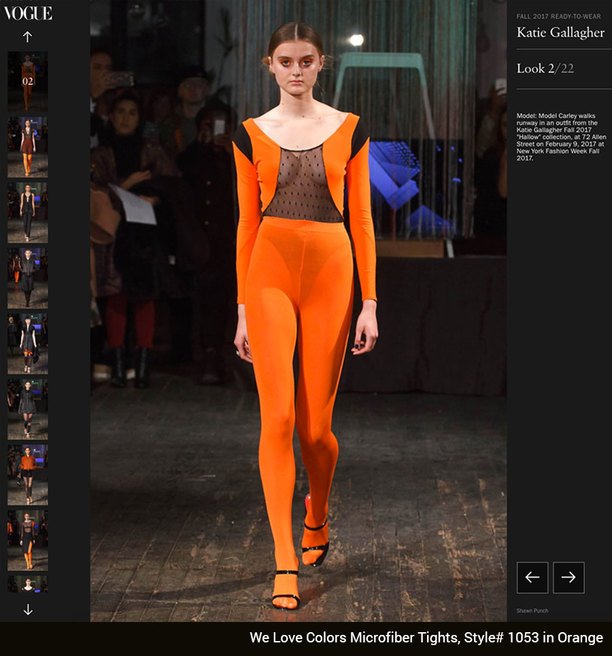 Orange We Love Colors Nylon/Lycra/Microfiber tights were used to accent Gallagher's beautifully sleek designs.