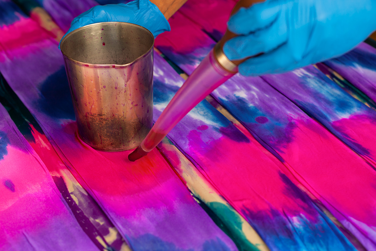 To begin, long pieces of recycled paper are laid out on a dedicated workspace to absorb moisture and protect the fabric from any stray dye that might alter the design. Next, the garment is wet slightly and laid on the paper. Our textile dye specialist prepares each dye that will be used for the specific splash color design. Each dye is individually placed by hand creating the unique splash design pattern. No stencils are used to create the design. The dye specialist knows the exact location for each color to keep the design consistent. The order in which each color is placed is extremely important to ensure that when the fabric is washed the colors blend together just right to create the desired pattern and color blends. It takes between 20-30 minutes to create the custom splash design on each garment.