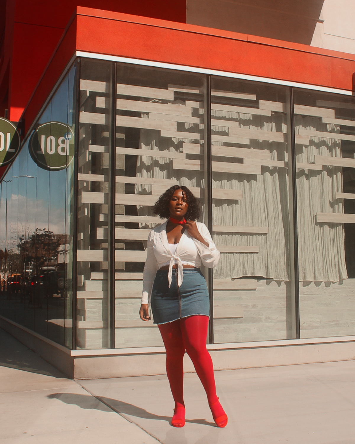 Upon receiving these tights in the mail, I knew immediately I wanted to do a full red leg. For this look, I was inspired by all the photos of women in the 50’s and 60’s who match their shoes with their tights. Which is why for this look, I paired together a white tie front top, a two-toned denim skirt, a red ascot, red heeled sandals and the cherry on top WLC’s tights in Red. — The tights and sandals blend together well and give this look an effortless feel.
