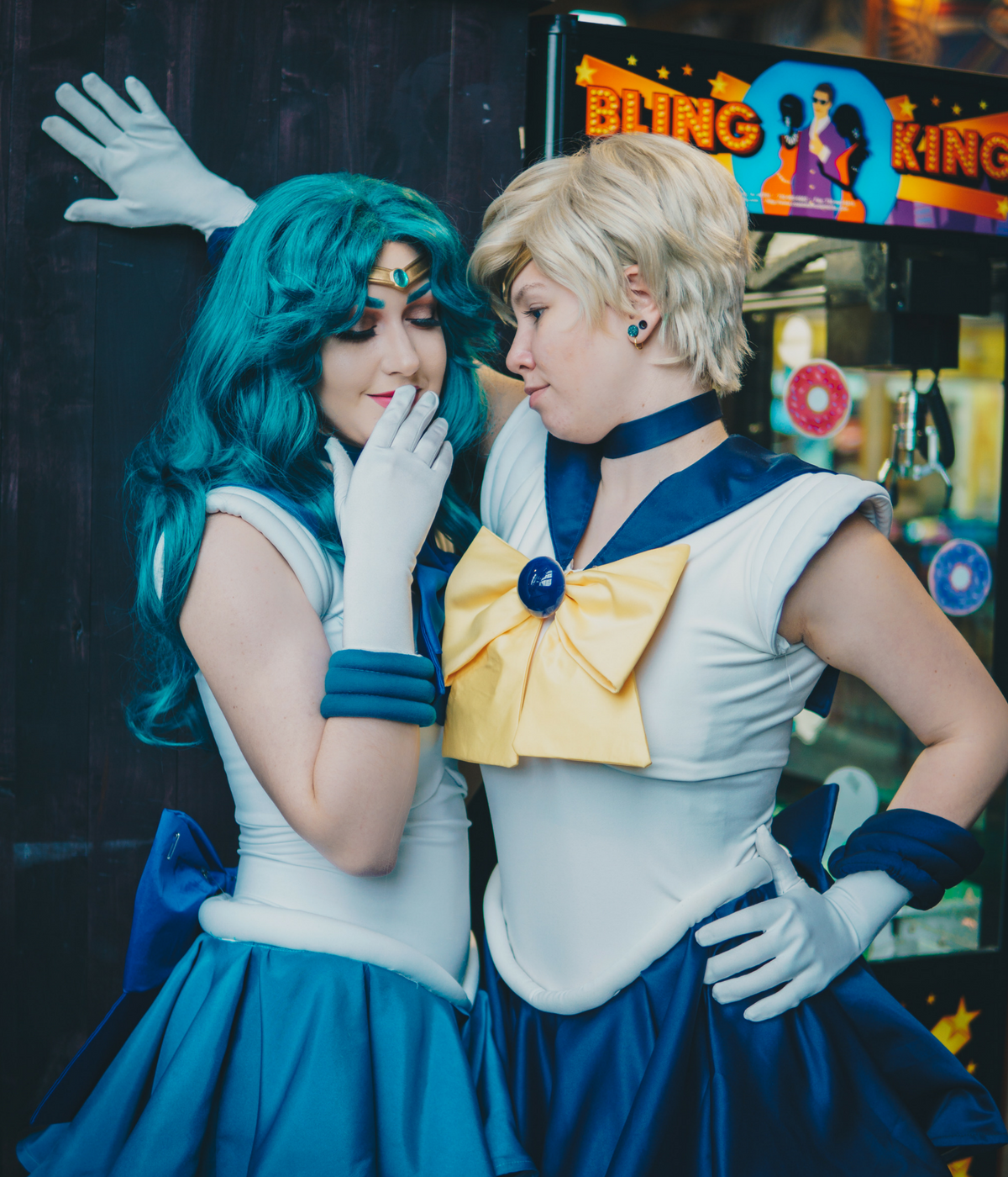 We Love Colors product and color: Sailor Neptune and Sailor Mars are wearing Style# 3407 Women’s Shoulder Gloves in White.