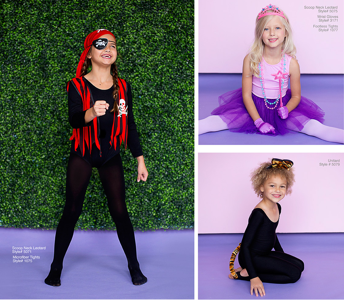 Quality, comfortable, stretchy leotards and unitards are available in any color you can think of. Mix and match them with our kids tights for unique happy looks and match the colors to their performance outfits or as base for any costume.