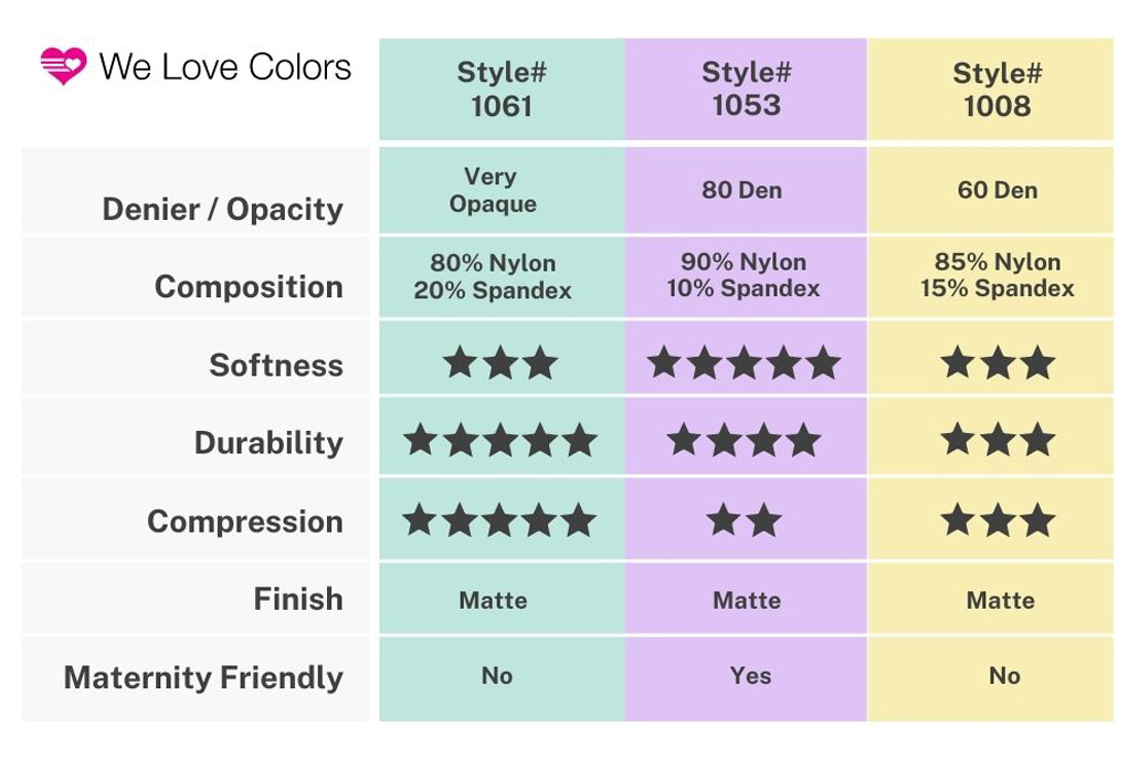 Knitted Tights, Microfiber Tights, Style#  1053 and Nylon/Spandex, Style# 1008 Opaque Tights Both are excellent options for everyday wear.