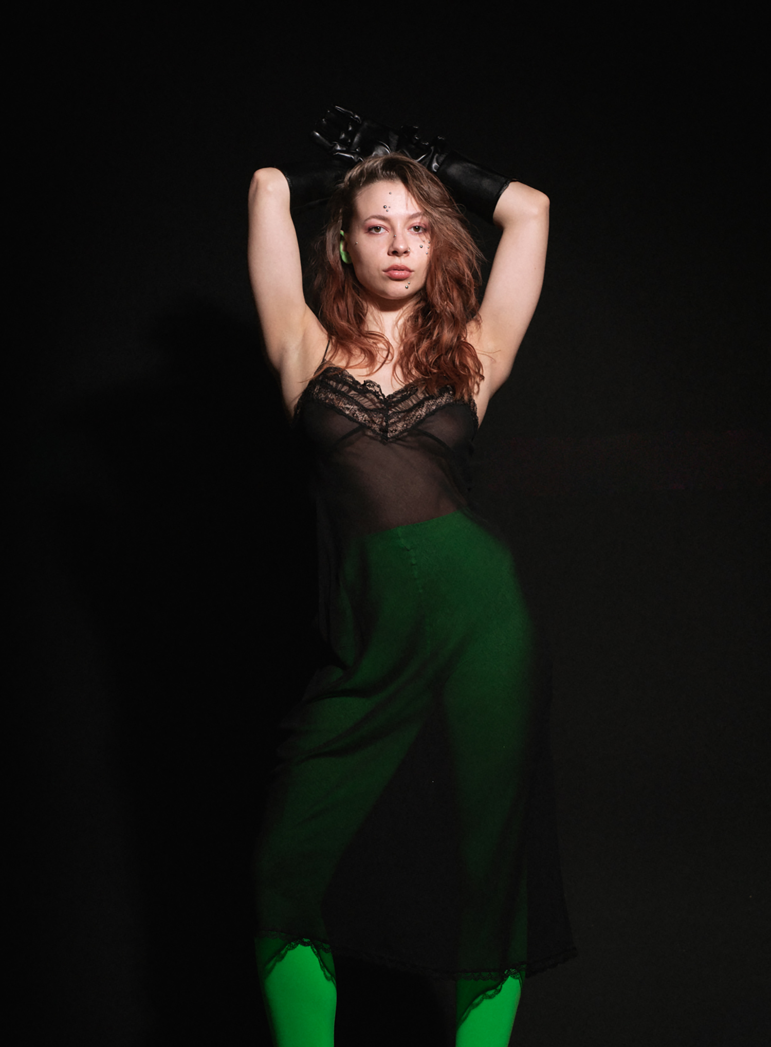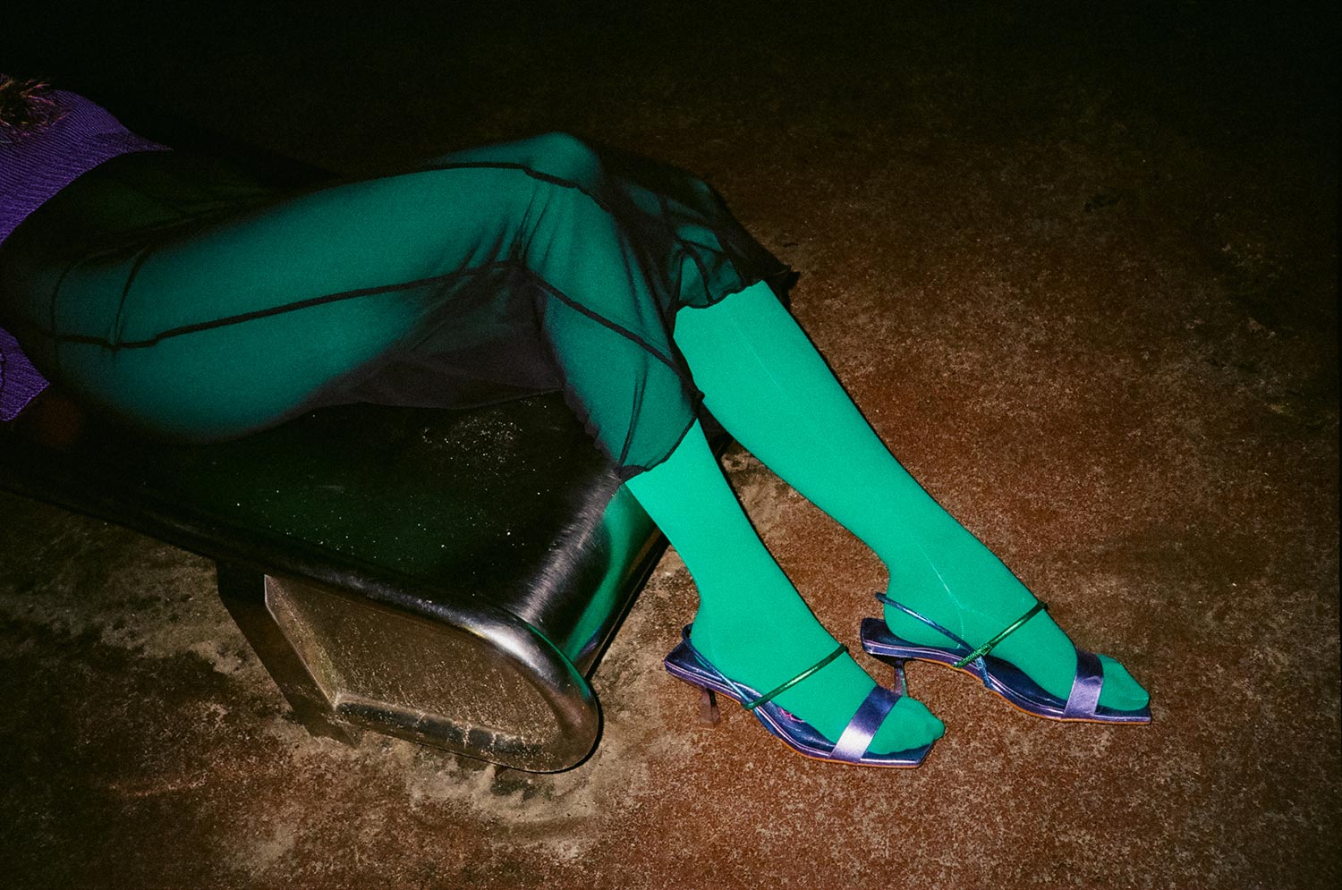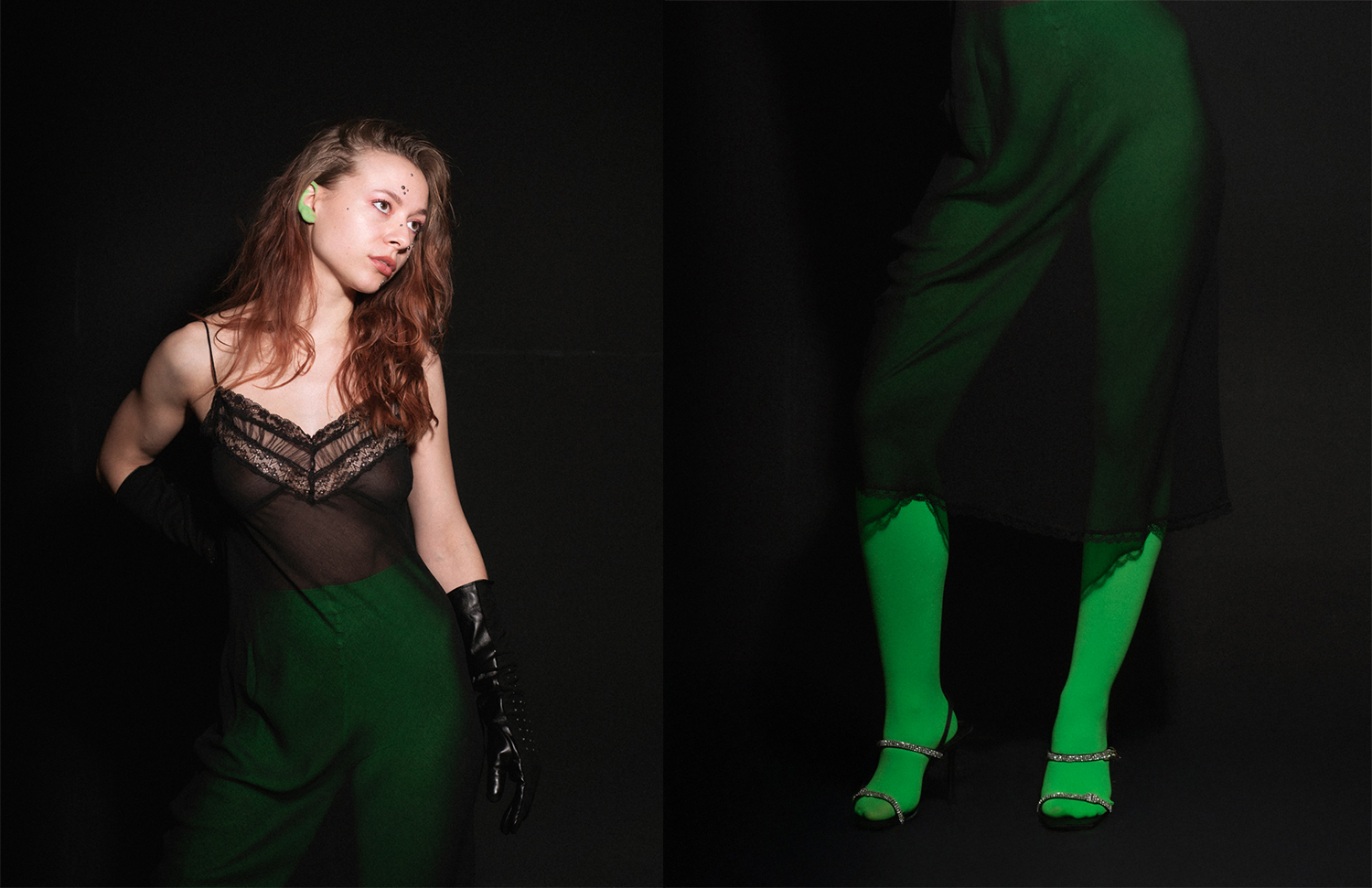• Green Tights with a Twist: These vibrant green tights are elevated with sheer black panels on the dress, creating a vertical line that elongates the legs and adds an unexpected element of sophistication.