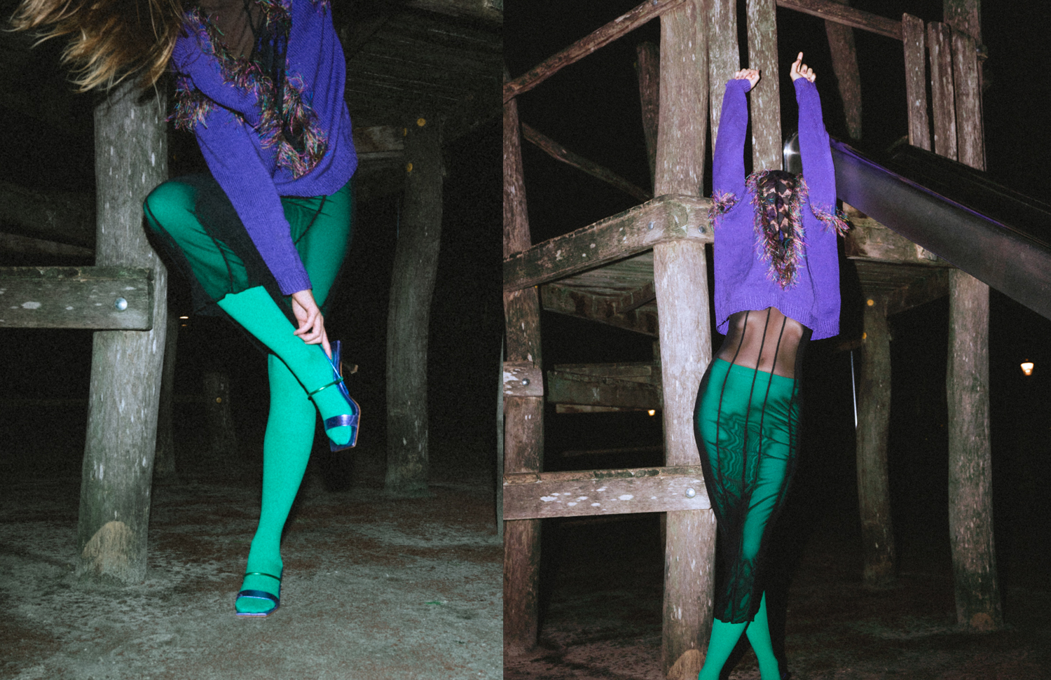 This outfit is the perfect example of what happens when opposites attract: a cozy hand-knitted purple sweater with playful fringe details meets sleek green tights layered under a sheer skirt. The result? A festive, daring ensemble that balances texture, color, and edge.