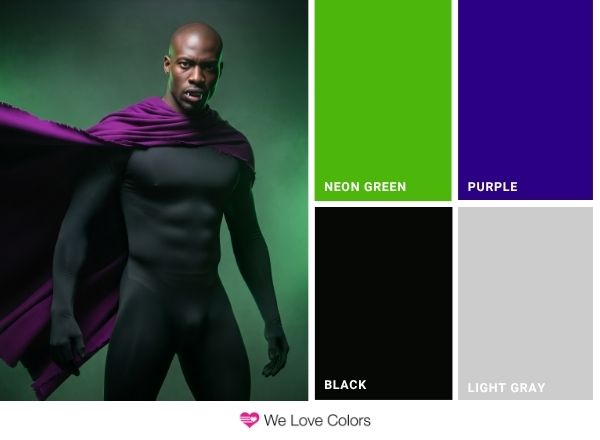 Neon Green+ Purple + Black + Light Grey (or Charcoal, for extra punch)