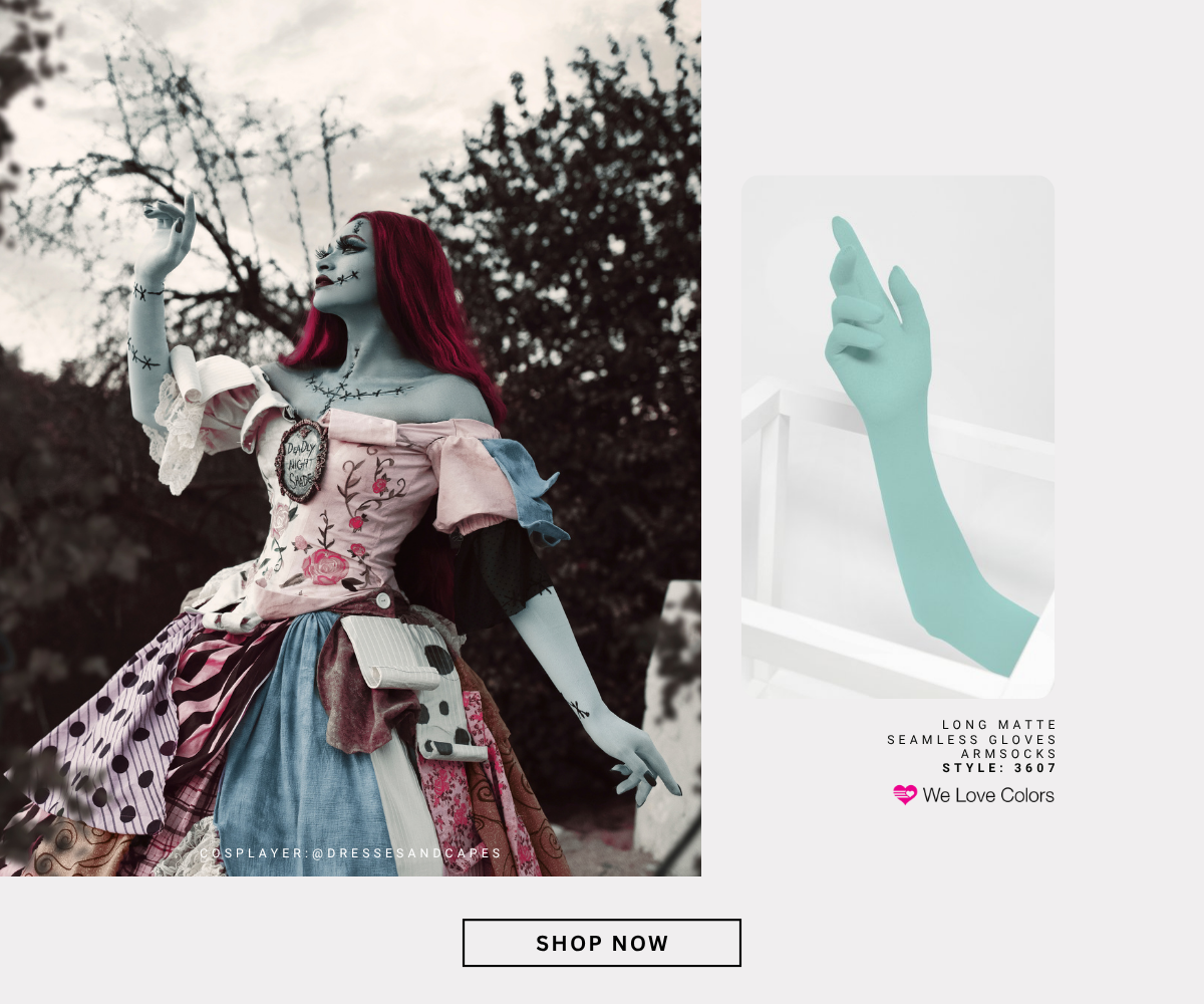 I found out about We Love Colors in 2021, and used them for the first time on my Sally cosplay using their arm socks and leggings. My Sally cosplay was my first big facepaint cosplay to garner attention, and I put a lot of effort into her. She is also a very cumbersome cosplay, hahaha. When I went to do that photoshoot my original plan was to drive myself and get dressed there but because of the sheer volume of the cosplay and all the elements, I ended up having my mom drive me in full cosplay.