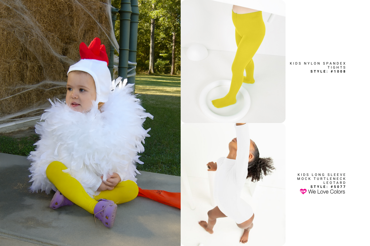 Example: For a little chick, start with ouryellow solid color tights #1008 and pair them with awhite leotard #5077. Add a fluffy white feather boa around the shoulders to create wings, and finish the look with a red felt comb on a white cap.