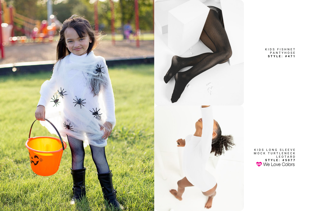 For a spooky spider-web look, start with ourwhite leotard #5077as the base. Layer with our Kids Fishnet Pantyhose #1471 for texture, then wrap lightweight spider-web fabric around the shoulders and add a few plastic spiders for detail. Pair with boots for comfort and extra style.
