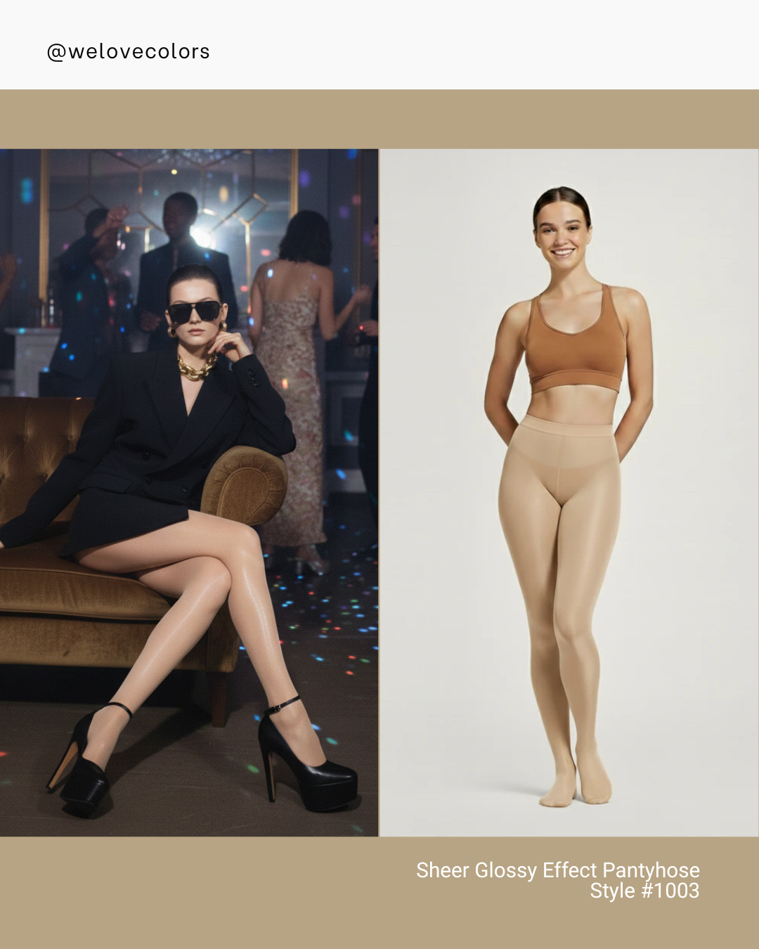 Shiny Underlayer: Real skin isn’t reflective. If the fabric is too shiny, it catches the light and reflects it, your skin becomes glowy! If that’s the effect you’re going for. Perhaps our Oily tights (Style#1003 )are a good fit for this. DIY tip! You can also cut the crotch area and top of the legs and turn it into a top. You put your head through the crotch area and your arms where the legs should go. So you have this oily, silky finish on arms and legs.