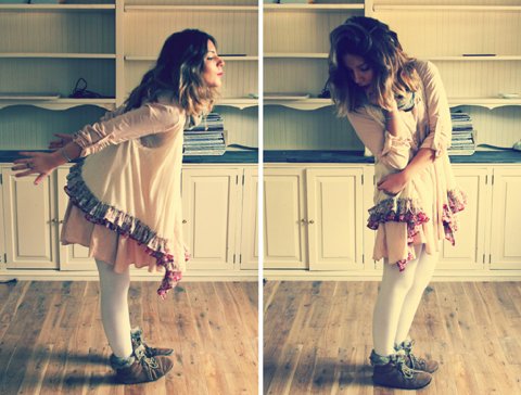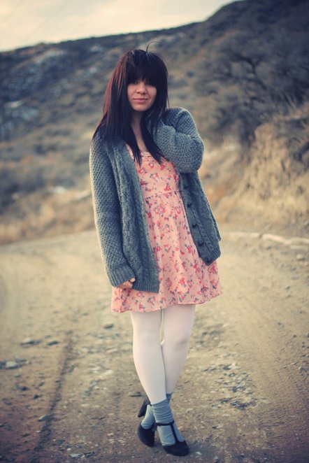 720480Kate of Postcards From... Wearing We Love Colors Microfiber Tights in ivory and Solid Color Nylon Socks in grey