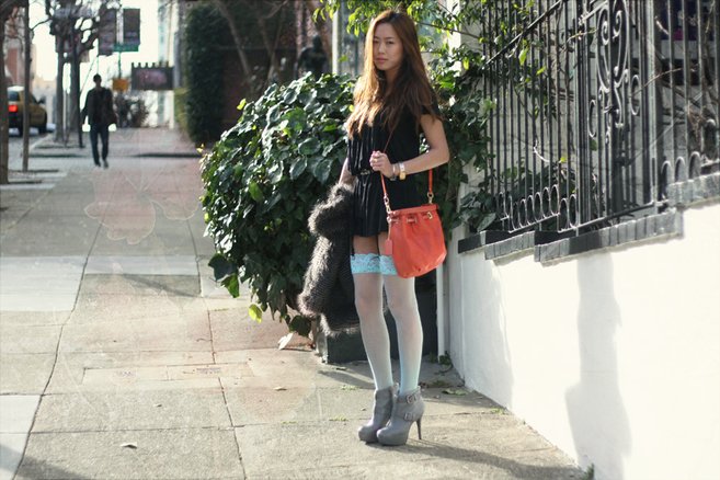 600900Trendsetter: Aimee Song of Song of Style Wearing: We Love Colors Pastel Mint Lace Fishnet Thigh Highs I couldn't say no to this coral like color and the shape of the bag