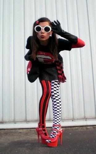 500311Lorena Cupcake of Juliet Banana Wearing: We Love Colors Red Vertical Striped Thigh Highs