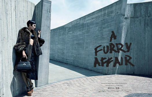 337525Swathed in a wardrobe of fur and boudoir pieces, Catherine McNeil graces the pages of Vogue Japan’s September issue