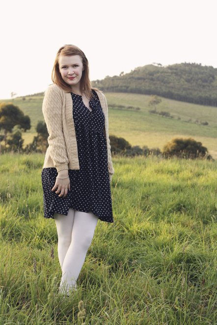 Hannah of Thursday’s Child Wearing We Love Colors Microfiber Tights Style# 1053 in Charcoal “(The tights) appear blue for some reason; I think it was because I was photographing them after the sun went down!”