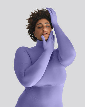 We have been working on this product for over 6 years, we finally have a fitted mock neck shirt, seamless torso, arms and fingers. It features a 5 inches seam on the shoulders to make it fit like a second skin. There's no hem on the neck or around the waist, the knitting of this shirt allows you to stretch it and wear it as a dress and even turn it into a bodysuit, or perhaps cut wherever you need without running into run issues, pun intended. For example: You can cut a slit on the wrist area if you wish to take the gloves off. We leave it up to you.